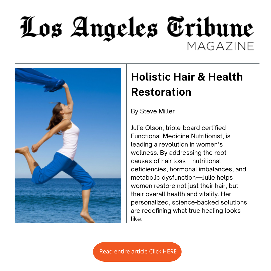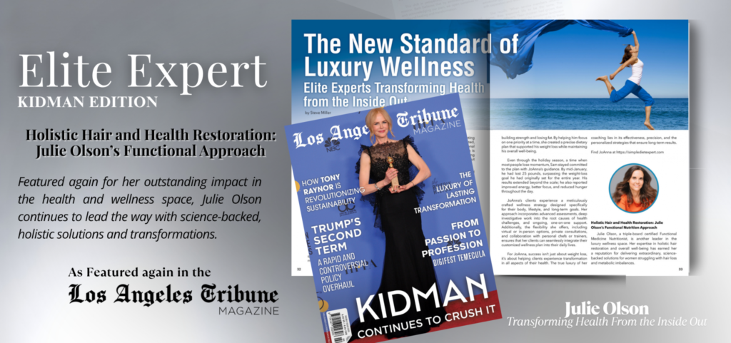Recognized for her science-backed approach to holistic hair and health restoration, Julie Olson was spotlighted as an Elite Expert in “The New Standard of Luxury Wellness” article for helping women overcome hair loss, fatigue, and hormonal imbalances by addressing the root causes from the inside out.