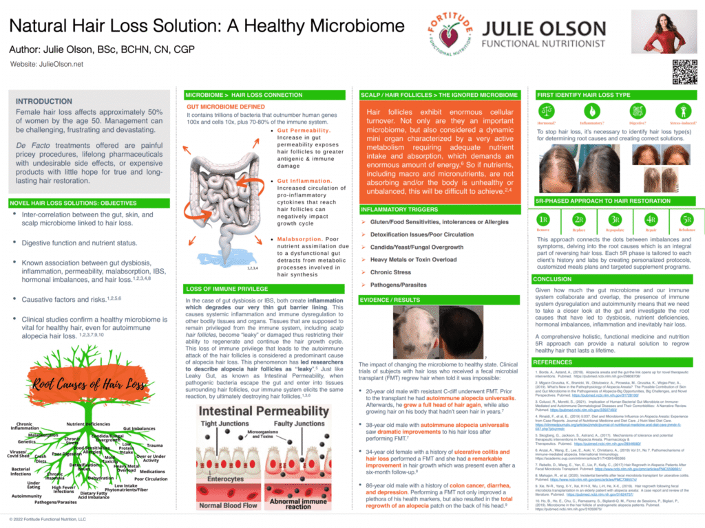 Studies confirm a healthy microbiome is vital for healthy hair, even for cases of alopecia. Hair is built from nutrients the body can efficiently digest and absorb and autoimmune hair loss can be a result of unresolved, chronic inflammation. Autoimmune diseases including alopecia have a common link to gut health. An imbalanced gut microbiome starts the process of permeability leading to leaky gut, a compromised gut barrier that facilitates inflammation.
